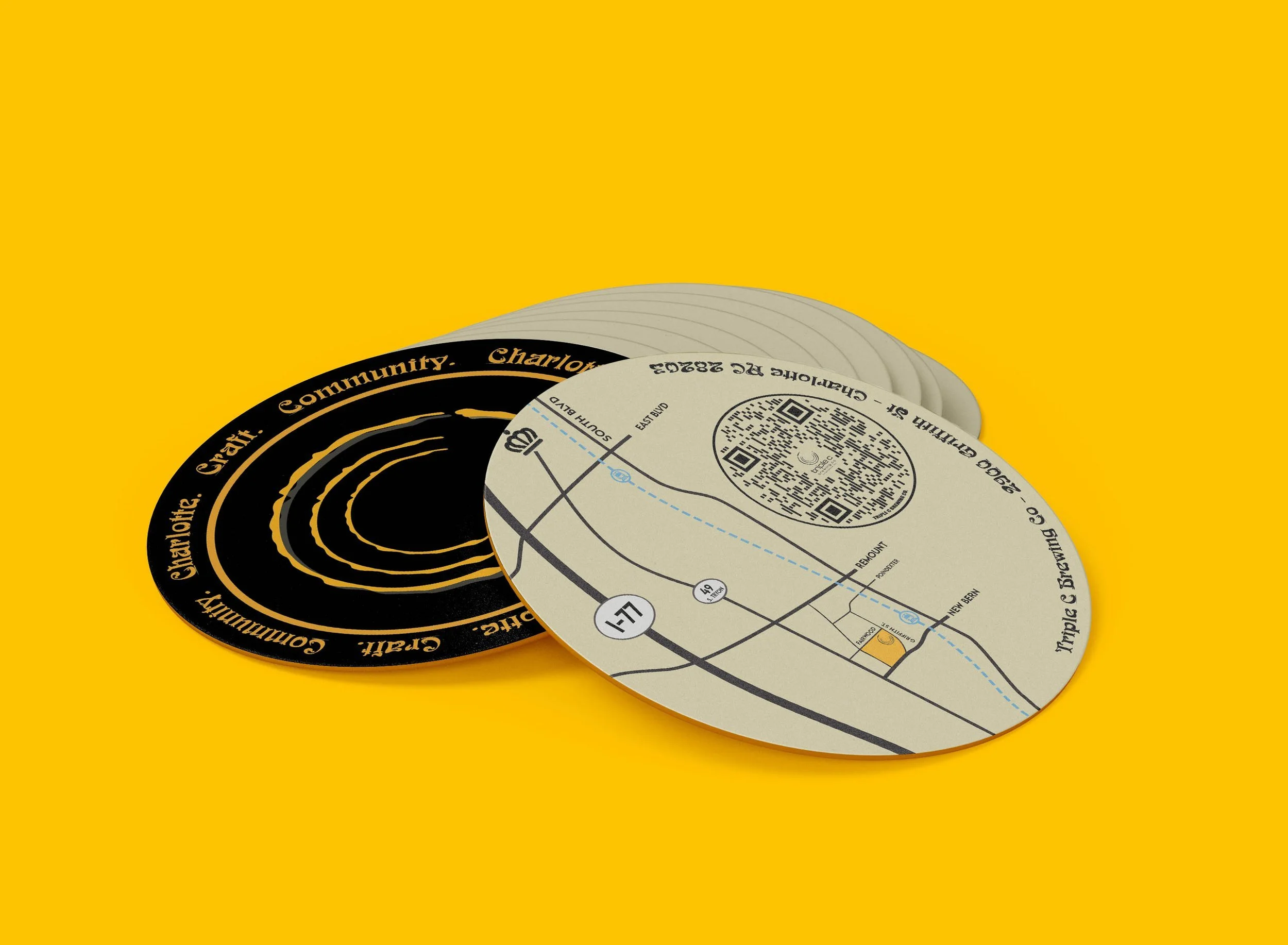 Wayfinding coasters for bar patrons with scannable QR code leading to Triple C's website.
