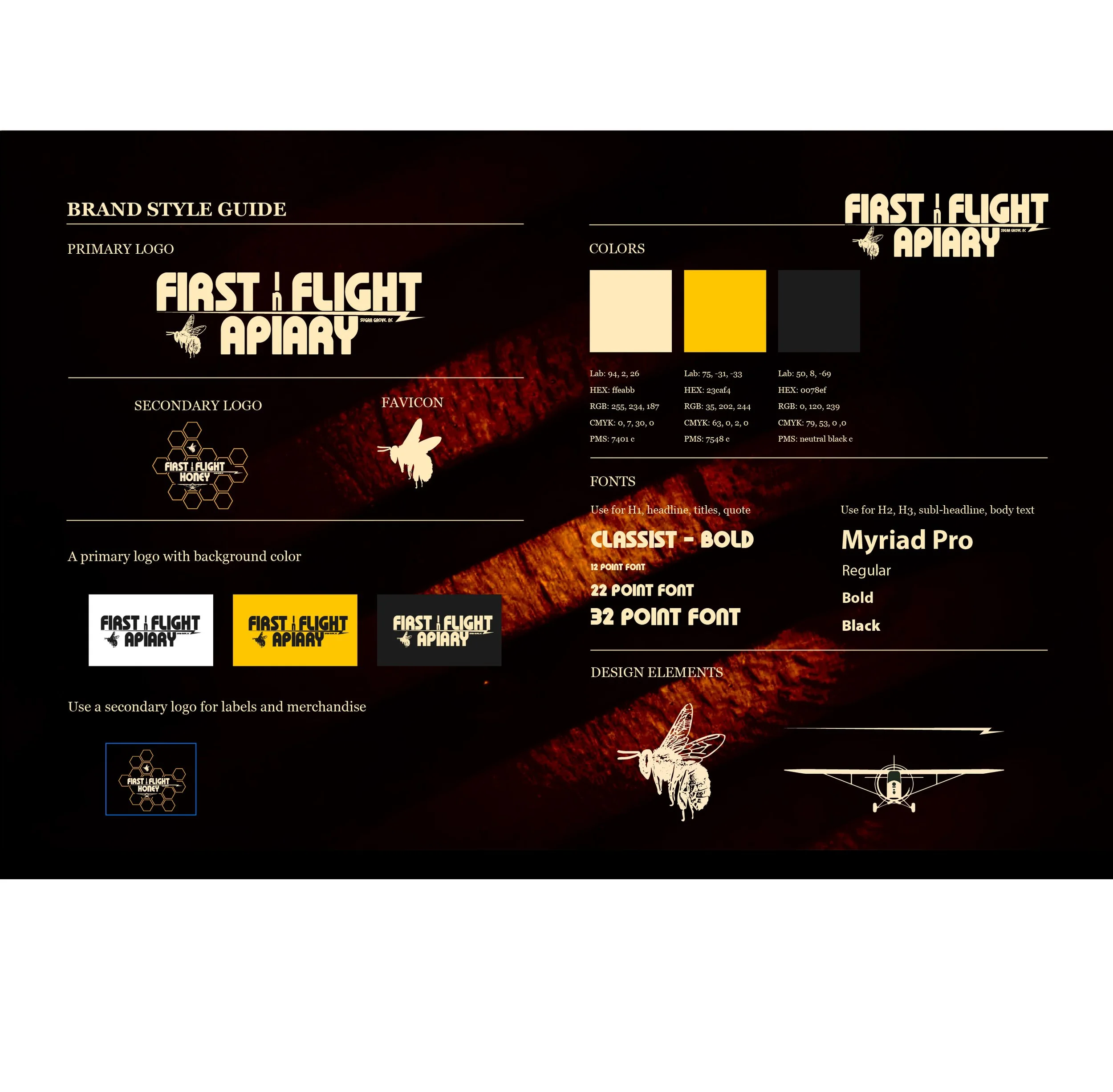 The brand styling for First in Flight bridges the gap between the past and the future, evoking a sense of nostalgia and anticipation. Embodied within the design are the harmonious spirits of humanity and nature, both soaring through the skies. The rich hues of gold and the velvety beige serve as a delectable reminder of the luscious creaminess found in every drop of honey, while the contrasting depth of the darker grey grounds us firmly to the earth. With every element meticulously crafted, this brand seamlessly unifies the essence of time and the wonders of nature into a captivating tapestry of visual delight.