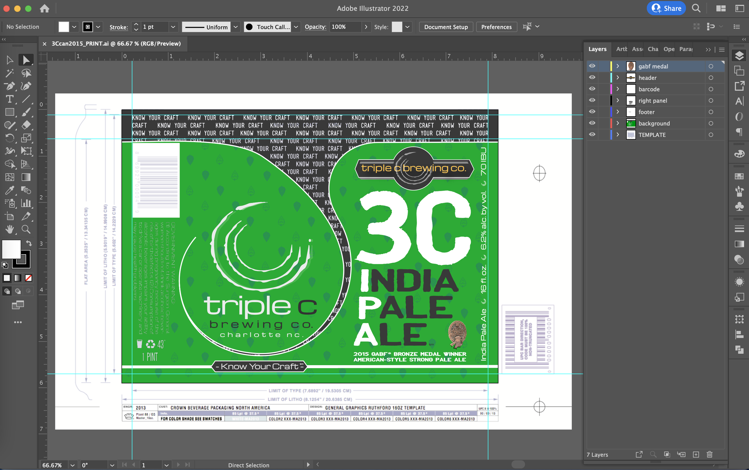 A decade of designs starting in 2012 with the first can design ideas. After a few iterations, a refresh in 2015 after winning a Great American Beer Festival medal for the 3C West Coast IPA. Finally in 2020, the most current label on shelves around the Carolinas.